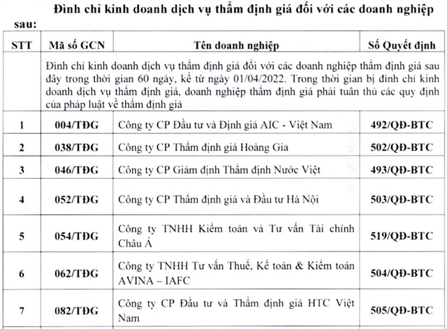 Cũng trong tháng 4, hàng loạt doanh nghiệp hoạt động trong lĩnh vực kinh doanh dịch vụ thẩm định giá cũng bị Bộ Tài chính mạnh tay đình chỉ trong vòng 60 ngày như Công ty cổ phần Đầu tư và Định giá AIC – Việt Nam, Công ty cổ phần Thẩm định giá Hoàng gia…