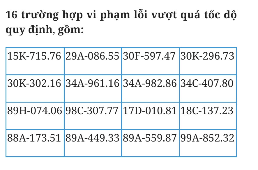 Theo báo cáo của Phòng Cảnh sát giao thông (Công an tỉnh Hưng Yên), từ ngày 6.10 đến ngày 12.10, qua khai thác hệ thống camera giám sát và sử dụng thiết bị nghiệp vụ, lực lượng cảnh sát giao thông đã ghi nhận nhiều trường hợp phương tiện vi phạm Luật Trật tự, an toàn giao thông đường bộ bị xử lý phạt nguội. Trong đó, lỗi vượt quá tốc độ quy định chiếm nhiều nhất với 16 trường hợp như sau: