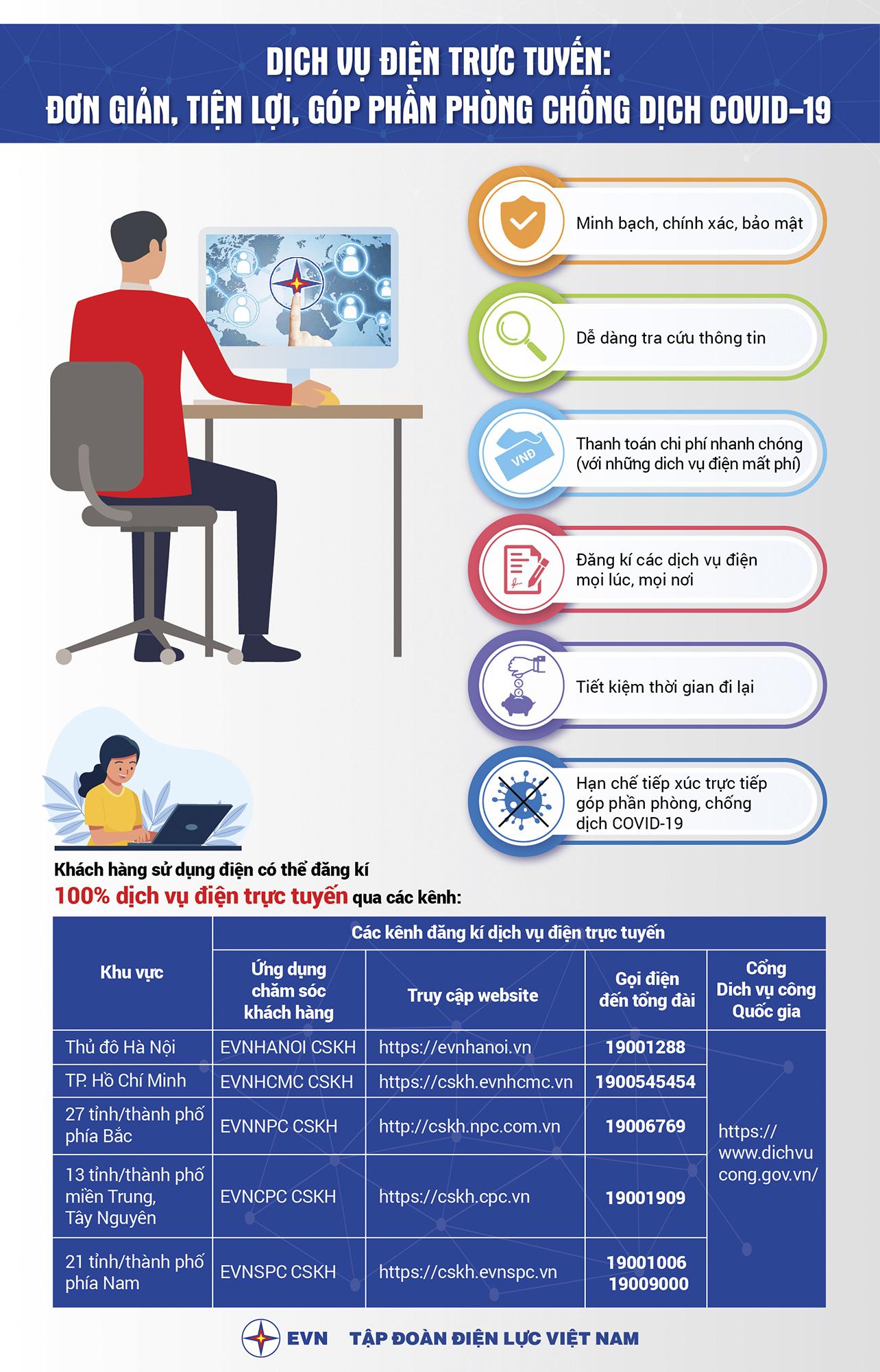 Trong bối cảnh đại dịch COVID-19 bùng phát và diễn biến phức tạp, tỉ lệ khách hàng lựa chọn kênh trực tuyến để đăng ký, yêu cầu các dịch vụ điện của Tập đoàn Điện lực Việt Nam (EVN) ngày càng tăng và chiếm tới trên 99% các yêu cầu về dịch vụ điện.