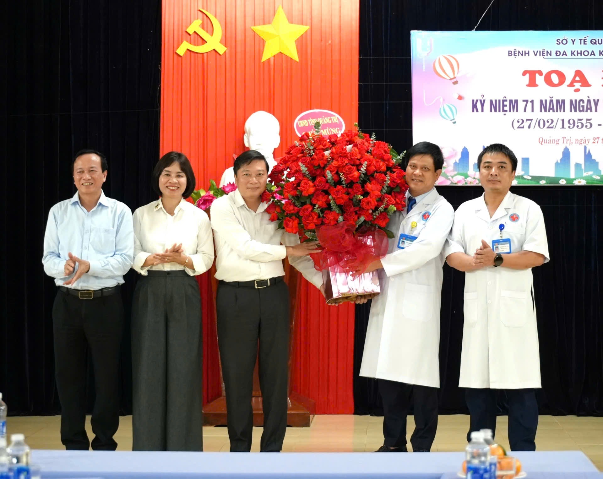 Chủ tịch UBND tỉnh Lê Hồng Vinh tặng hoa và gửi lời chúc tốt đẹp nhất đến cán bộ, nhân viên Bệnh viện đa khoa khu vực Đồng Hới nhân kỷ niệm 71 năm Ngày Thầy thuốc Việt Nam. Ảnh: T.Đ