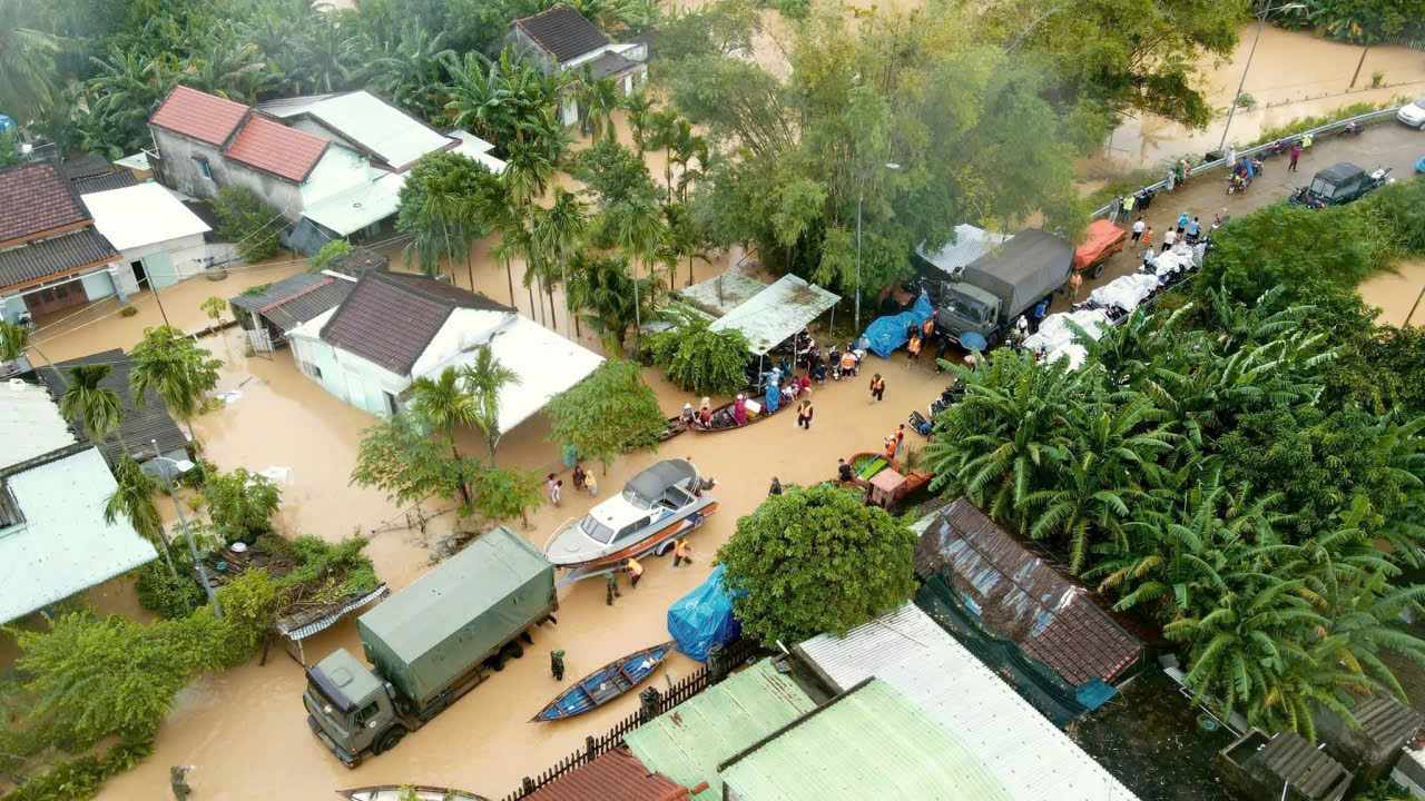 Mưa lớn kéo dài, gây ngập lụt nghiêm trọng ven sông Vu Gia, Thu Bồn (Đà Nẵng), hàng trăm ngôi nhà bị ngập sâu từ 3 đến 4 mét, nhiều tuyến đường bị chia cắt, giao thông tê liệt. Ngay khi tiếp cận các vùng bị cô lập, lực lượng quân đội đã phối hợp chặt chẽ với chính quyền xã lên phương án tiếp tế lương thực, thực phẩm, nước uống và nhu yếu phẩm cho bà con.