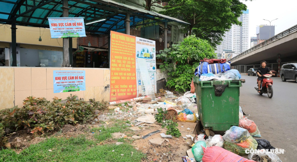 Tại khu vực đường Láng, dù các quy định cấm đổ rác và mức xử phạt đã được dán tại nhiều vị trí, tình trạng rác thải vẫn bị vứt bừa bãi, tràn xuống cả lòng đường. Không chỉ làm xấu mỹ quan đô thị, tình trạng này còn ảnh hưởng trực tiếp đến người tham gia giao thông, đặc biệt tại khu vực ngã tư có mật độ phương tiện qua lại cao.