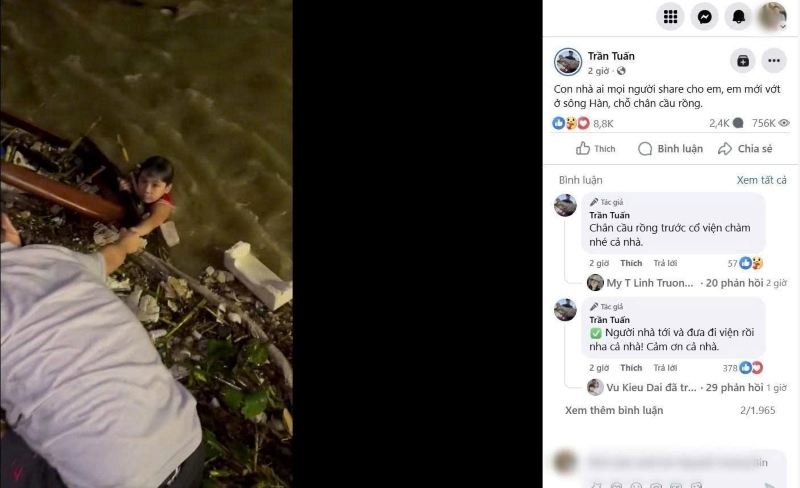 Thời điểm xảy ra vụ việc, mưa lớn kéo dài khiến mực nước sông Hàn dâng cao, dòng chảy mạnh, mặt bờ trơn trượt. Nhiều người dân xung quanh đã chủ động dừng xe, chiếu đèn điện thoại, hỗ trợ ánh sáng để nhóm cứu hộ thao tác. Sau khi được cứu, cháu bé được người dân giúp thay áo, ủ ấm và bàn giao lại cho gia đình.