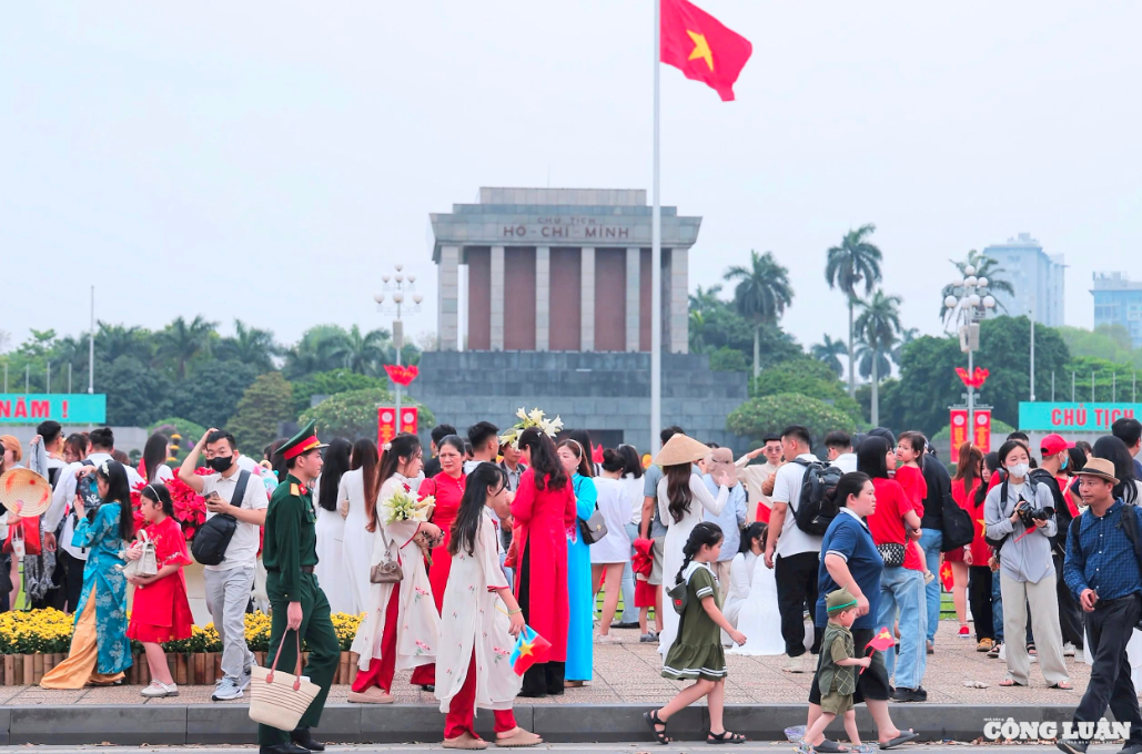 Chị em xúng xính áo dài check-in trước Quảng trường Ba Đình chào mừng đại lễ 30/4.