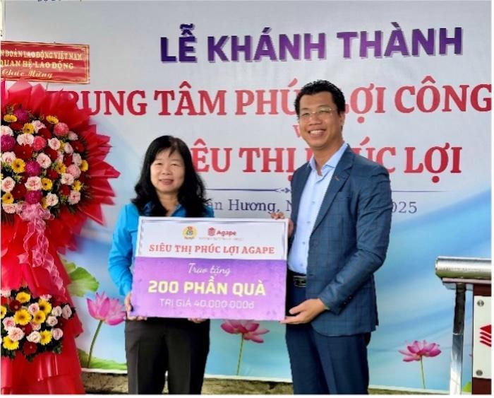 Dịp này, Giám đốc Phúc lợi Agape ông Nguyễn Hoàng Nam trao tặng bảng tượng trưng 200 phần quà trị giá 40.000.000 đồng cho LĐLĐ Tỉnh để hỗ trợ đoàn viên có hoàn cảnh khó khăn trên địa bàn tỉnh năm 2025, đồng thời trao tặng 10 phần quà gồm những nhu yếu phẩm thiết yếu đến đoàn viên, người lao động có hoàn cảnh khó khăn của Công ty TNHH Dụ Đức Việt Nam.