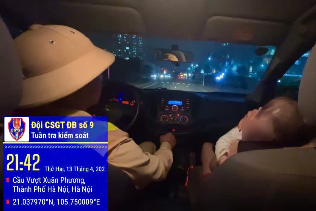 Theo đó, vào khoảng 21h30 ngày 13.4.2026, Tổ công tác do Trung tá Nguyễn Anh Tú – Phó Đội trưởng Đội Cảnh sát giao thông đường bộ số 9 (Phòng CSGT, Công an TP Hà Nội) làm Tổ trưởng, phối hợp với Công an xã Liên Minh thực hiện nhiệm vụ tại Km10+500 Tỉnh lộ 422 (địa bàn xã Sơn Đồng) thì bất ngờ tiếp nhận đề nghị hỗ trợ khẩn cấp từ một người phụ nữ bế theo con nhỏ.
