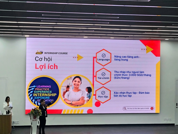 Tại ngày hội, ông Trần Văn Chính, Giám đốc Công ty TNHH Tư vấn du học và việc làm quốc tế AGS, cho biết đang có nhu cầu tuyển dụng thực tập sinh tại sân bay Changi (Singapore) – một trong những sân bay 5 sao hàng đầu thế giới. Singapore đang đối mặt với tình trạng thiếu hụt lao động đáng kể, vì vậy đây sẽ là cơ hội phát triển cho sinh viên. Sinh viên thực tập ở đây sẽ có mức lương khoảng 3.000 USD/tháng, tương đương với nhân viên chính thức.