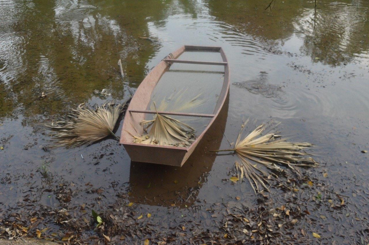 Chiếc thuyền mắc cạn dưới lòng hồ. Ảnh: Bích Lộc