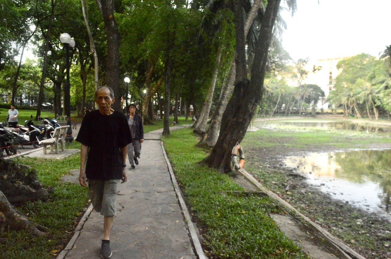 Người dân đi bộ xung quanh khu vực hồ nước cạn khô trong công viên Bách Thảo. Ảnh: Bích Lộc.