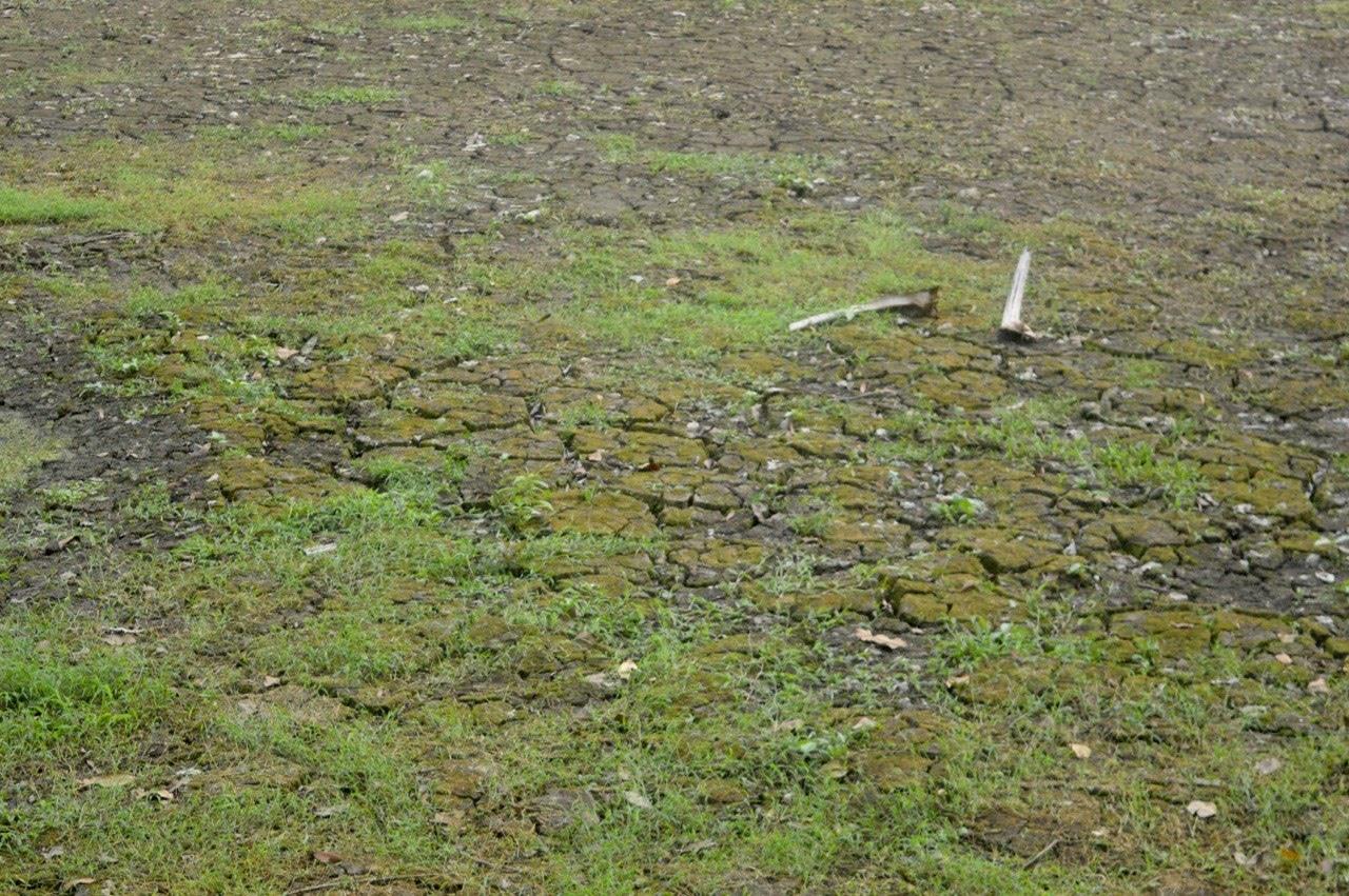 Dưới lòng hồ, nhiều cây cỏ mọc phát triển cao quá đầu người, có những khu vực cây cỏ còn bị cháy khô.