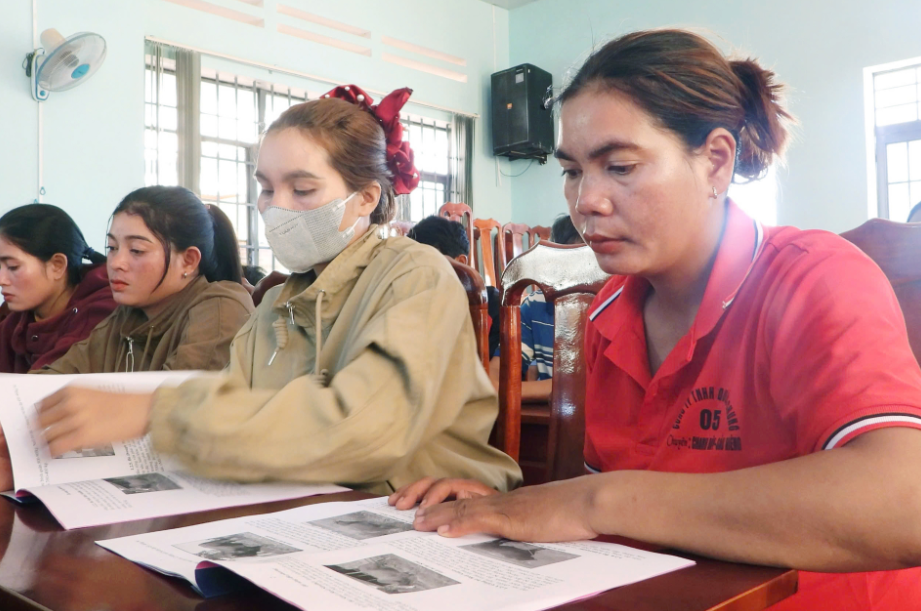 Người dân Đắk Lắk nghiên cứu tài liệu hướng dẫn cách làm chuồng trại chăn nuôi tại lớp tập huấn chăm sóc bò cái sinh sản, nhằm hỗ trợ phát triển sản xuất cộng đồng. Ảnh: T.L