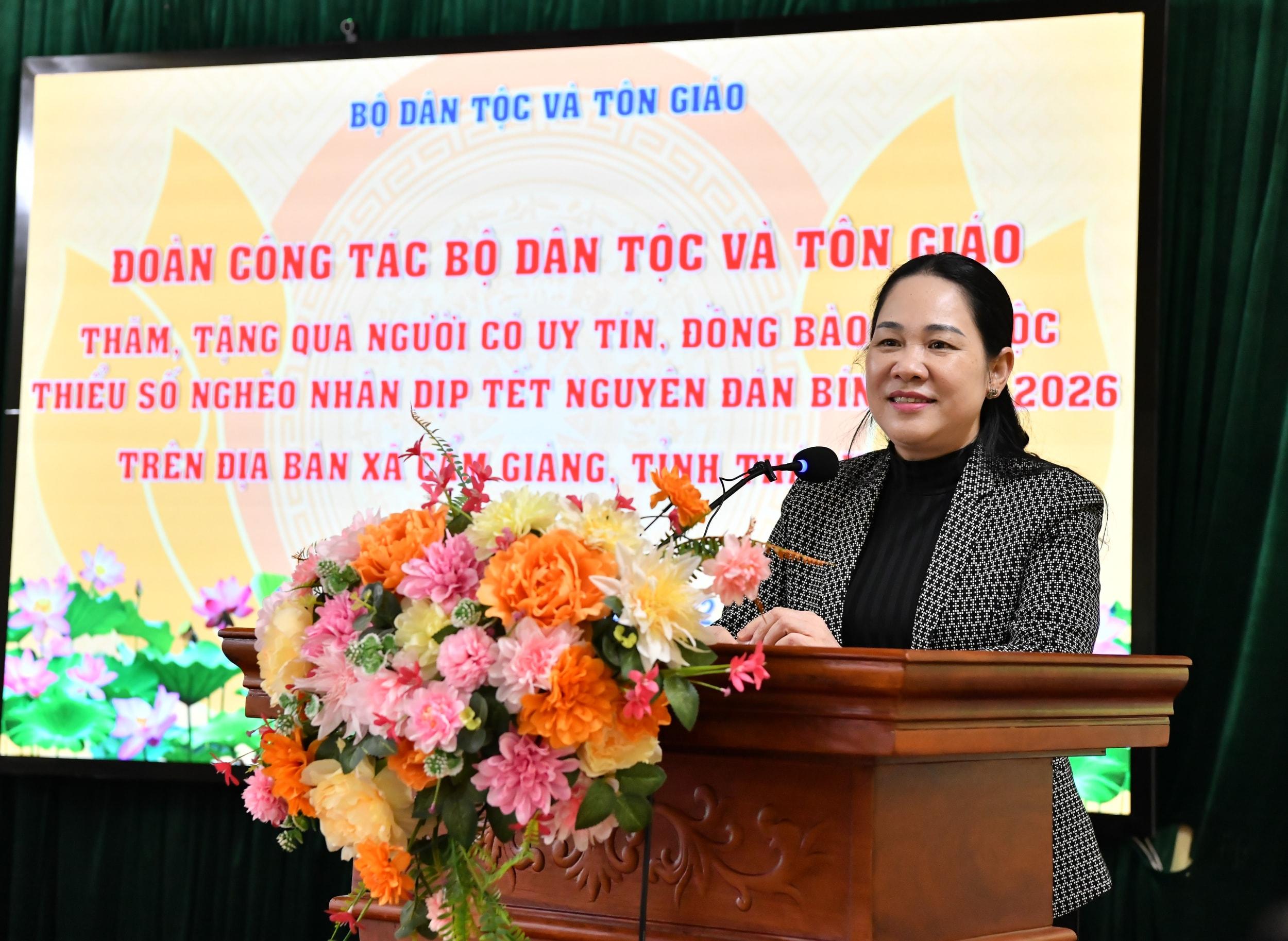 Thứ trưởng Bộ Dân tộc và Tôn giáo Nông Thị Hà phát biểu chúc Tết Nguyên đán Bính Ngọ người có uy tín và hộ nghèo người dân tộc thiểu số trên địa bàn xã Cẩm Giàng, tỉnh Thái Nguyên - Ảnh: Nguyên Hải.