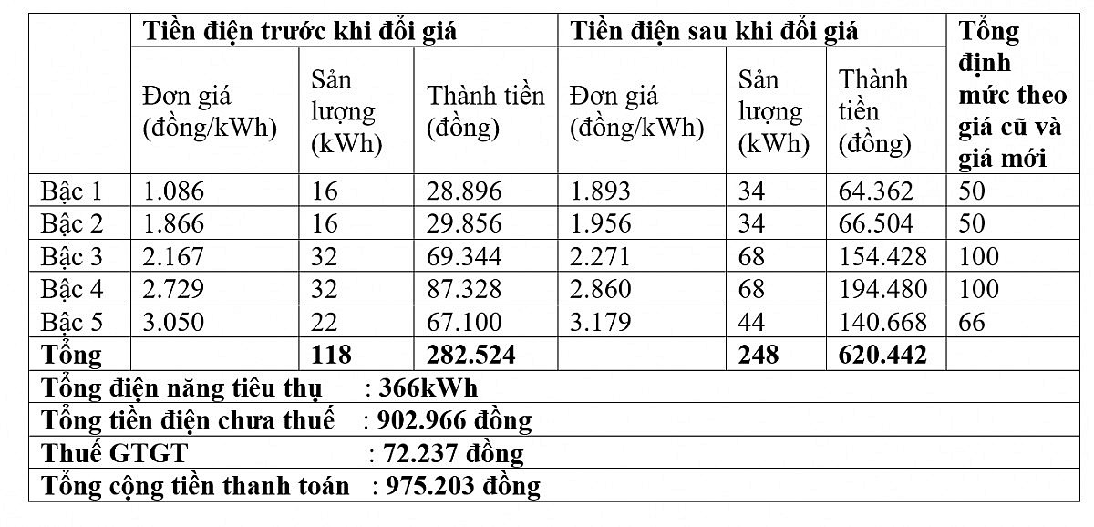 Đối với khách hàng ký hợp đồng mua điện phục vụ mục đích sinh hoạt, sản lượng điện để tính giá cũ và giá mới như sau: