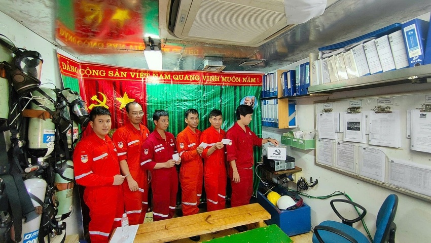 Các đảng viên Chi bộ Giàn nén khí mỏ Rồng tham gia Đại hội trực tuyến, bỏ phiếu tại giàn |