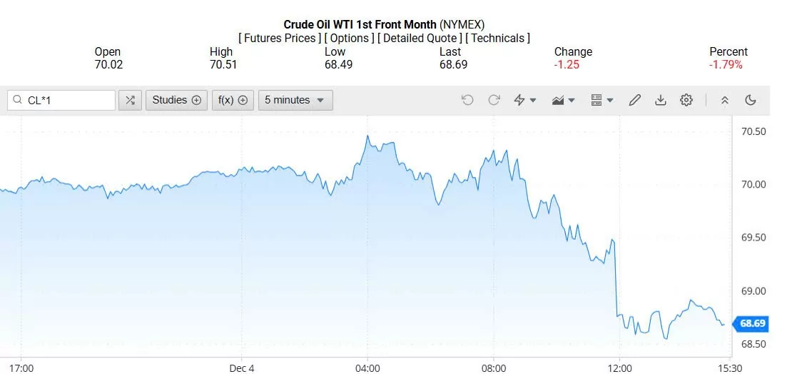 Ghi nhận trên Oilprice lúc 4h30 ngày 05/12/2024 (theo giờ Việt Nam), giá dầu WTI ở mốc 68,69 USD/thùng, giảm 1,79% (tương đương giảm 1,25 USD/thùng).
