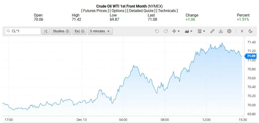 Ghi nhận trên Oilprice lúc 4h30 ngày 14/12/2024 (theo giờ Việt Nam), giá dầu WTI ở mốc 71,09 USD/thùng, tăng 1,51% (tương đương tăng 1,06 USD/thùng).
