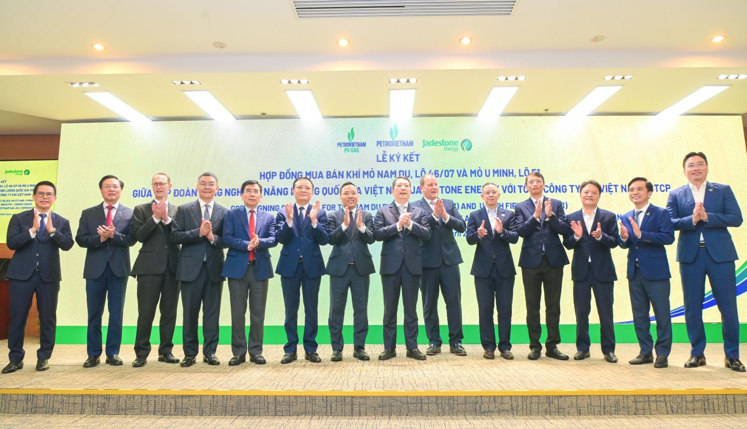 | Phó Tổng Giám đốc Petrovietnam Lê Mạnh Cường; Tổng Giám đốc Công ty Jadestone Energy Thomas Mitchell Little; Phó Tổng Giám đốc PV GAS Huỳnh Quang Hải ký kết hợp đồng mua bán khí mỏ Nam Du - U Minh dưới sự chứng kiến của các lãnh đạo tham dự buổi lễ |