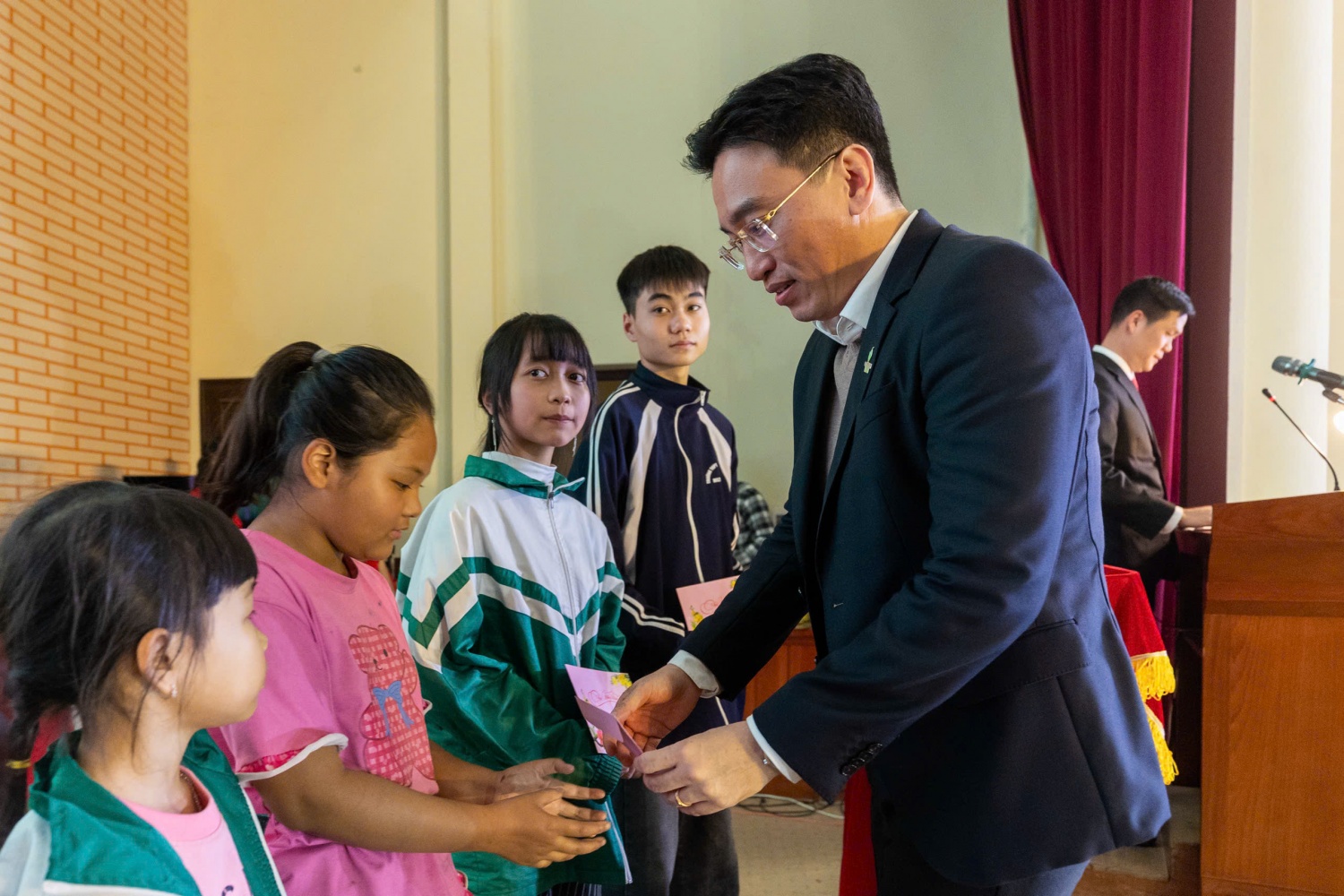 | Đồng chí Nguyễn Việt Thắng - Tổng Giám đốc BSR tặng quà cho các em nhỏ có hoàn cảnh khó khăn tại xã Mễ Sở. |