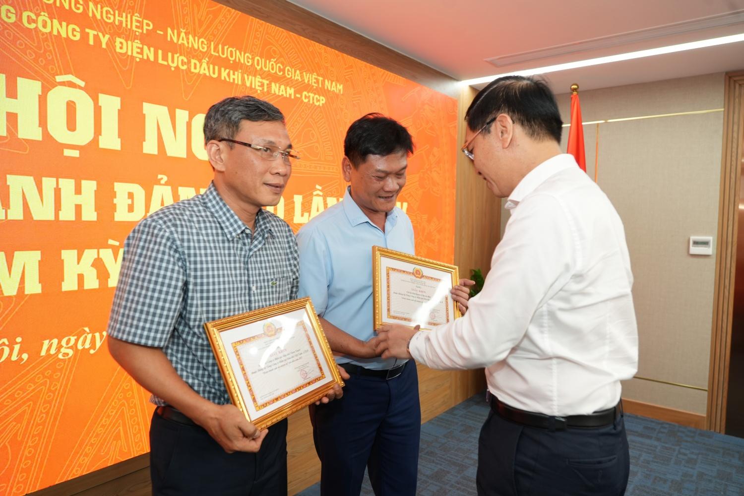 | Đồng chí Hoàng Văn Quang - Bí thư Đảng ủy, Chủ tịch HĐQT PV Power và đồng chí Lê Như Linh - Phó Bí thư Đảng ủy, Tổng Giám đốc PV Power trao Giấy khen cho các đảng viên hoàn thành xuất sắc nhiệm vụ năm 2025. |