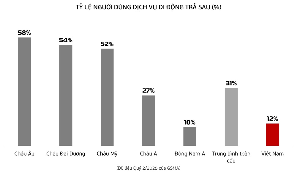 Theo báo cáo của GSMA, đến hết Quý 2/2025, tỷ lệ người dùng di động sử dụng dịch vụ trả sau (postpaid) đang chiếm ưu thế tại nhiều khu vực trên thế giới. Cụ thể, châu Âu và châu Đại Dương có mức sử dụng cao nhất với tỷ lệ lần lượt là 58% và 54%, tiếp đến là châu Mỹ với 52%, trong khi châu Á đạt 27% và Đông Nam Á chỉ ở mức 10%. Tính trung bình, 31% thuê bao di động toàn cầu hiện đang dùng dịch vụ trả sau.
