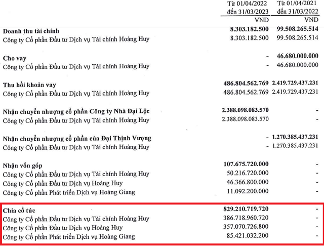 CRV được biết đến như “gà đẻ trứng vàng” của hệ sinh thái Hoàng Huy. Trong 6 tháng đầu năm, CRV đã chi hơn 403 tỷ đồng trả cổ tức, cao gần gấp đôi so với khoản lãi 206 tỷ đồng đạt được, trong đó có hơn 329 tỷ đồng chảy vào nhóm cổ đông TCH. Năm trước đó, CRV cũng chi đến 1,016 tỷ đồng trả cổ tức (841 tỷ đồng cổ tức năm 2021 và 175 tỷ đồng cổ tức năm 2022), nhóm cổ đông TCH cũng đã nhận đến 829 tỷ đồng trong số đó.