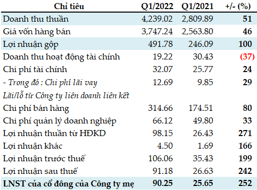 Cụ thể, doanh thu thuần tăng 51%, đạt hơn 4,239 tỷ đồng. Trong khi đó, giá vốn tăng nhẹ hơn giúp biên lãi gộp nhảy vọt lên 492 tỷ đồng, gấp đôi cùng kỳ. Biên lãi gộp cũng cải thiện từ gần 9% lên 12%. Ngược lại, doanh thu hoạt động tài chính giảm 37%, xuống còn 19 tỷ đồng.