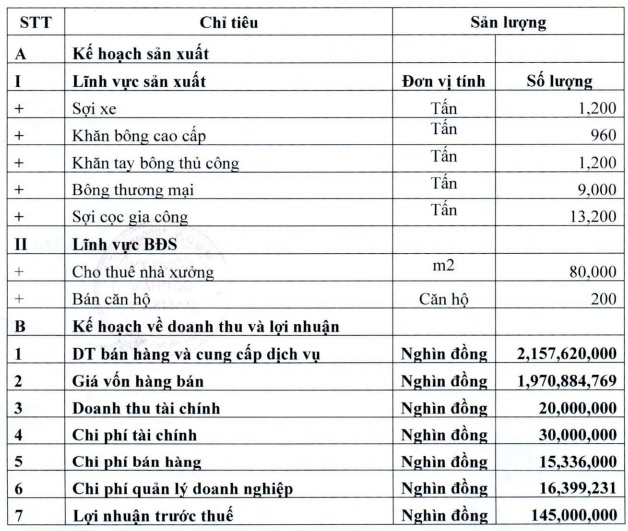Về kế hoạch sản xuất 2026, Doanh nghiệp đặt mục tiêu tăng mạnh sản phẩm sợi xe (từ 720 tấn lên 1,200 tấn). Các sản phẩm khác giữ nguyên như kế hoạch 2025.