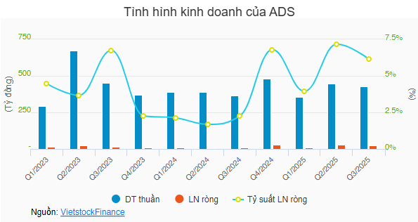 Trong 9 tháng đầu năm 2025, ADS đạt hơn 1.2 ngàn tỷ đồng doanh thu, lãi trước và sau thuế lần lượt 78 tỷ đồng và 64 tỷ đồng. Dù tăng mạnh so với cùng kỳ năm trước, tỷ lệ thực hiện kế hoạch mới đạt 62% mục tiêu doanh thu và 64% kế hoạch lãi trước thuế. Hiện, Doanh nghiệp chưa công bố kết quả kinh doanh quý 4/2025 nên chưa rõ có hoàn thành kế hoạch 2025 hay không.