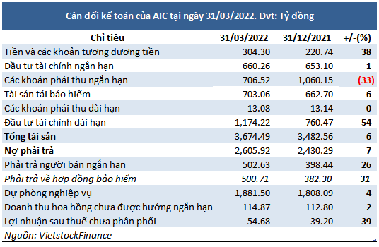 Tính đến cuối quý 1/2022, tổng tài sản của AIC tăng 6% so với đầu năm, lên mức hơn 3,674 tỷ đồng, chủ yếu do khoản đầu tư dài hạn tăng 54%, đạt hơn 1,174 tỷ đồng.