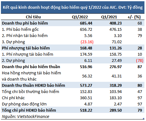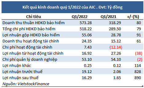 Trong quý 1 năm nay, hoạt động kinh doanh bảo hiểm của AIC có kết quả khả quan với doanh thu phí bảo hiểm thuần tăng 87% so cùng kỳ, đạt gần 278 tỷ đồng, dẫn đến doanh thu thuần hoạt động kinh doanh bảo hiểm tăng 32%, đạt gần 517 tỷ đồng.