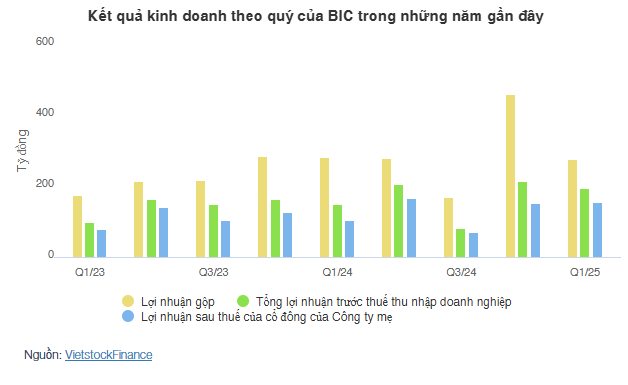 Quý 1/2025, lãi gộp từ hoạt động bảo hiểm của BIC đạt 275 tỷ đồng, giảm nhẹ 2% so với cùng kỳ năm trước. Tuy nhiên, lãi ròng vẫn tăng mạnh 47%, đạt 154 tỷ đồng, nhờ hoạt động tài chính khởi sắc với lãi gộp tăng 24% lên 154 tỷ đồng.