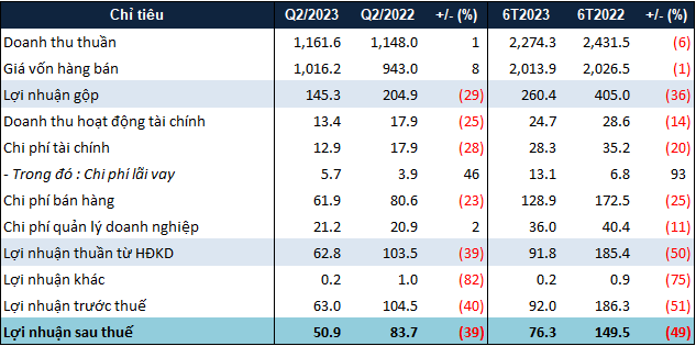 Kết quả kinh doanh quý 2 và lũy kế 6 tháng đầu năm 2023 của DRC. Đvt: Tỷ đồng
