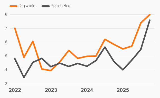 Cả 2 đều là những nhà phân phối ủy quyền Apple tại Việt Nam, qua đó, hưởng lợi từ sự kiện mở bán sớm iPhone 17. Ngoài ra, trong khi Petrosetco kín tiếng, Digiworld trong năm qua đã khá năng nổ bắt tay với các nhãn hàng mới, mở rộng danh mục sản phẩm cho kênh phân phối.
