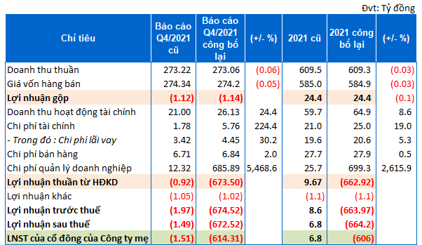 Ngoài ra, trên bảng cân đối kế toán, tổng tài sản tính đến cuối năm 2021 cũng điều chỉnh giảm 464 tỷ đồng so với báo cáo cũ, nguyên nhân là tăng dự phòng các khoản phải thu ngắn hạn khó đòi từ 111 tỷ đồng lên 785 tỷ đồng, ngoài ra khoản phải thu ngắn hạn của khách hàng tăng từ 551 tỷ đồng lên 750 tỷ đồng.