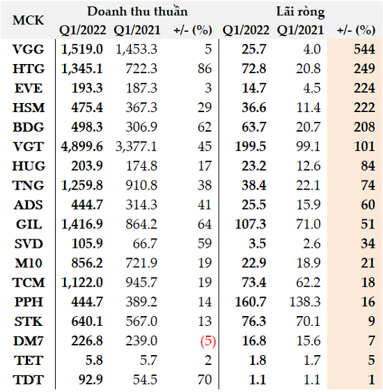 Hay như Tổng CTCP Dệt may Hà Nội (UPCoM: HSM), May mặc Bình Dương (UPCoM: BDG), Tập đoàn Dệt May Việt Nam (Vinatex, UPCoM: VGT) cũng đồng loạt báo lãi tăng bằng lần.