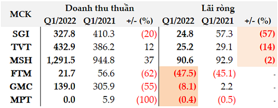 Doanh nghiệp dệt may báo lãi ròng giảm và thua lỗ trong quý 1 (Đvt: Tỷ đồng) Nguồn: VietstockFinance |