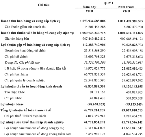 Doanh thu thuần và doanh thu tài chính quý 1/2022 tăng lần lượt 6% và 14% so cùng kỳ, đạt 1,060 tỷ đồng và 25.5 tỷ đồng.
