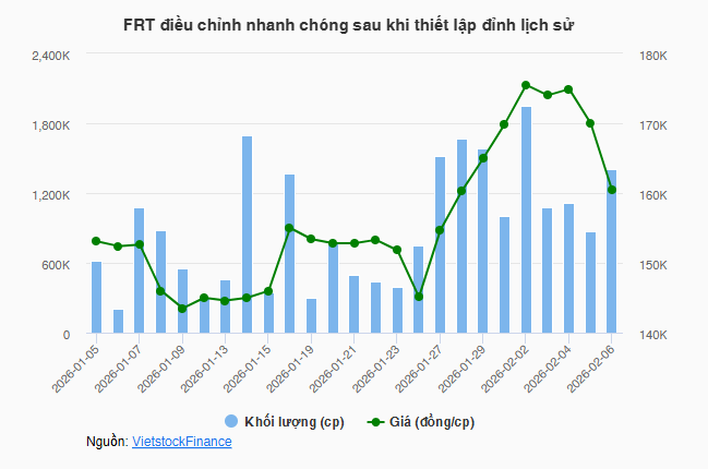 Trên thị trường chứng khoán, cổ phiếu FRT lập tức ghi nhận các phiên tăng nóng sau khi thông tin kết quả kinh doanh tích cực được công bố, đưa cổ phiếu tiến một mạch từ vùng 145,000 đồng/cp lên đỉnh lịch sử trên 175,000 đồng/cp, tương ứng tăng khoảng 21%. Tuy nhiên, FRT nhanh chóng gặp áp lực sau đó và điều chỉnh về vùng 160,000 đồng/cp khi kết phiên 06/02.