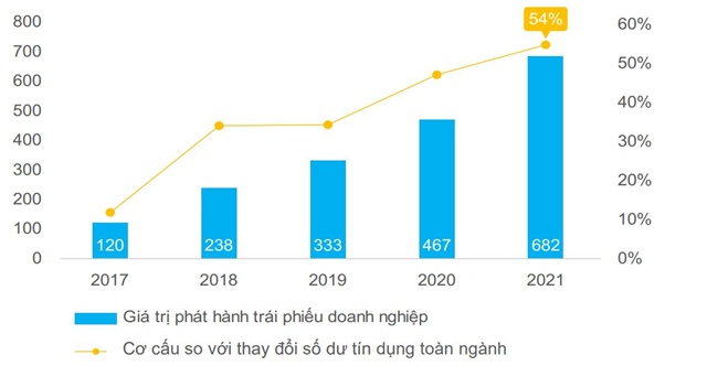 Năm 2021, quy mô huy động qua kênh trái phiếu doanh nghiệp trong nước đã đạt 682.000 tỉ đồng. Đây là kênh huy động vốn rất lớn bởi con số này chiếm 54% của thay đổi số dư tăng trưởng tín dụng mới toàn hệ thống trong năm 2021. Mức này cũng đã vượt qua mức thay đổi số dư tăng trưởng tín dụng mới trung và dài hạn của hệ thống Ngân hàng thương mại Việt Nam, theo FiinRatings.