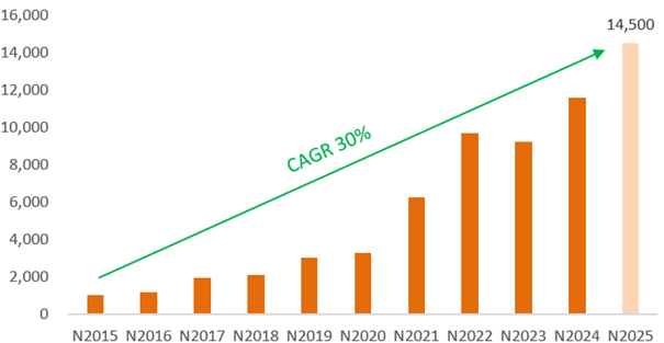 Năm 2025, SHB đặt mục tiêu lợi nhuận trước thuế tăng 25% lên mức 14,500 tỷ đồng. Nhìn lại 10 năm, SHB đạt tăng trưởng luỹ kế hàng năm (CAGR) hơn 30% và năm 2025 nếu đạt kế hoạch đề ra thì sẽ là mức lợi nhuận trước thuế cao nhất của Ngân hàng kể từ khi thành lập. Nửa đầu năm, lợi nhuận trước thuế lũy kế 6 tháng đạt 8,913 tỷ đồng, tăng 30% so với cùng kỳ năm 2024, tương đương 61% kế hoạch năm 2025.