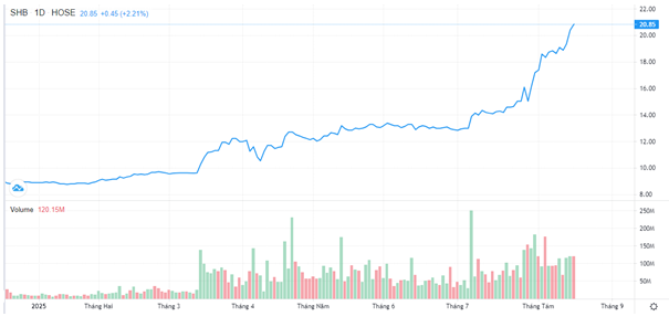 Cuối tuần trước, cổ phiếu SHB kết thúc phiên 15/8 với thanh khoản dẫn đầu thị trường đạt 120 triệu đơn vị và bất chấp thị trường điều chỉnh, thị giá cổ phiếu SHB tăng 2.2%. đóng cửa ở mức 20,850 đồng/cổ phiếu, hơn gấp đôi đầu năm.
