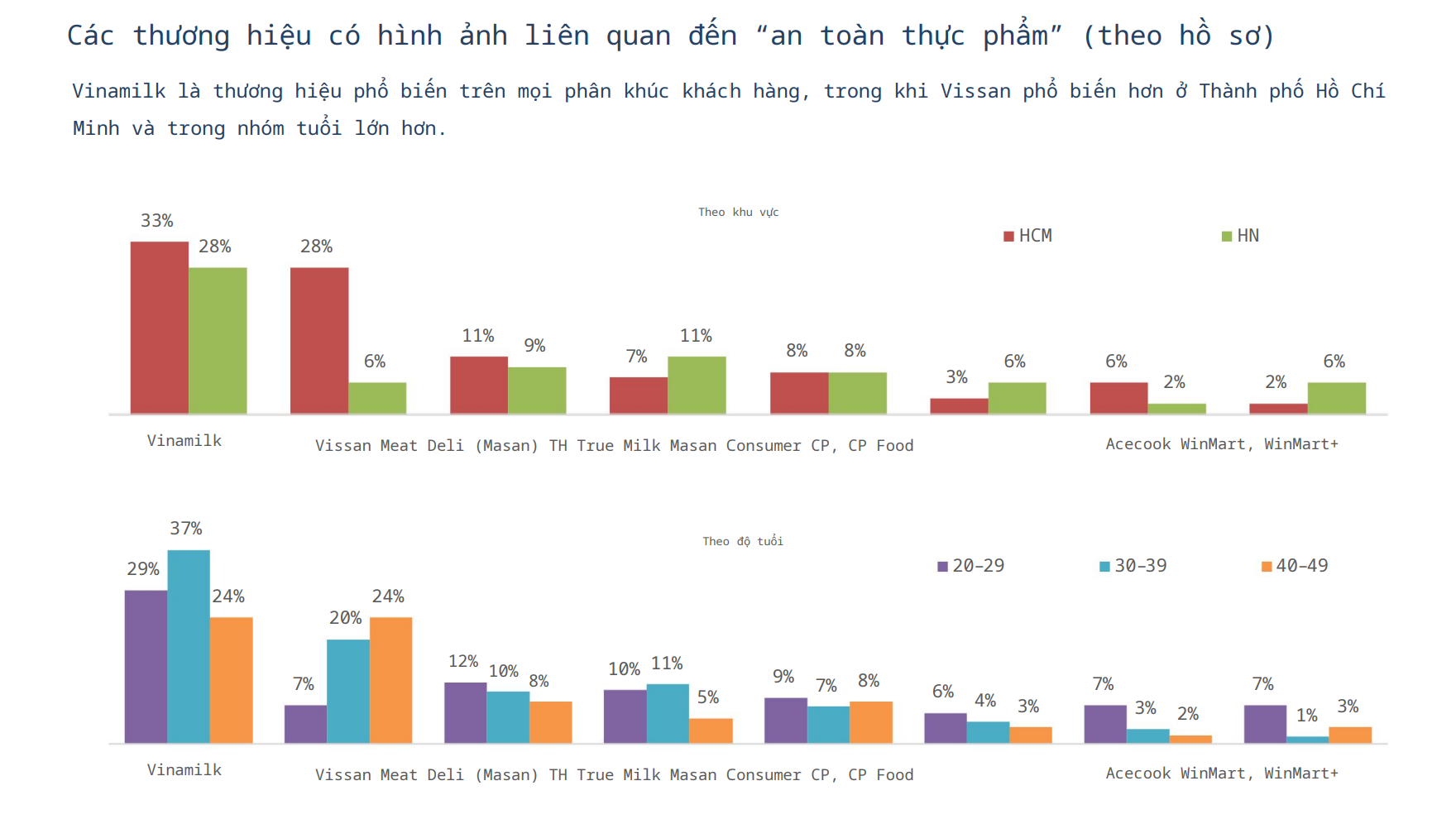 Các thương hiệu trong nước như Vinamilk, Vissan và Masan (Meat Deli, Masan Consumer) dẫn đầu mức độ ghi nhớ, theo sau là CP, TH True Milk và Acecook. Đáng chú ý, danh sách này gần như không xuất hiện các thương hiệu nhỏ, hộ kinh doanh cá thể hay nhà sản xuất địa phương.