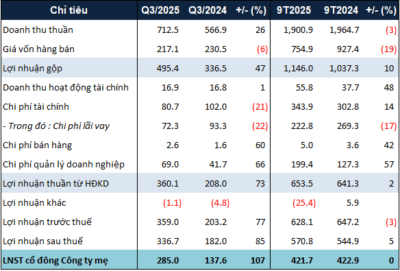 Theo BCTC hợp nhất, CTCP Tập đoàn Hà Đô (HOSE: HDG) ghi nhận doanh thu thuần gần 713 tỷ đồng trong quý 3/2025, tăng 26% so với cùng kỳ. Tuy nhiên, giá vốn lại giảm 6%, nhờ đó lãi gộp tăng 47%.
