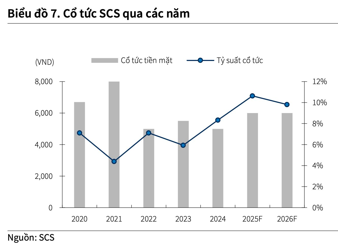 SCS luôn duy trì mức chi trả cổ tức tiền mặt cao trong những năm gần đây. Trong ĐHCĐ vào tháng 6 vừa qua, SCS đã thông qua đề xuất cổ tức 3.000 VND/cổ phiếu cho năm 2025.