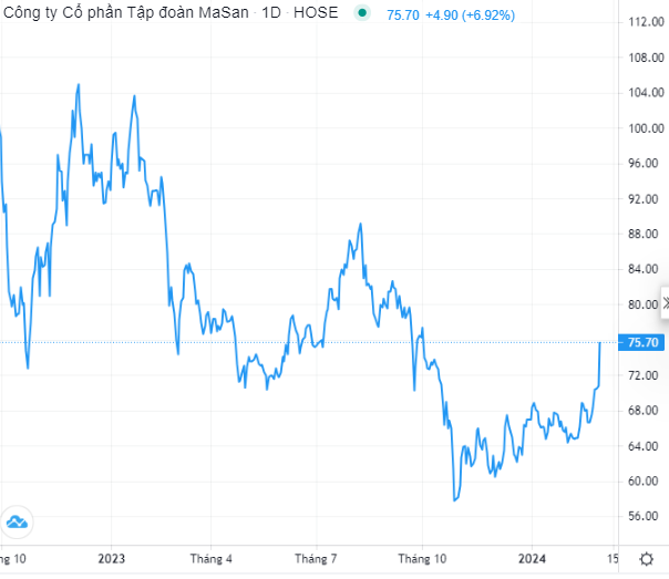 Kết thúc phiên giao dịch ngày 6/3, cổ phiếu MSN tăng 1,59% lên mức 76.800 đồng/cp. Thị giá MSN cũng đã tăng gần 15% kể từ đầu năm, kéo theo vốn hóa thị trường của Masan Group tăng 14.000 tỷ lên đạt gần 110.000 tỷ đồng (tương đương 4,4 tỷ USD).