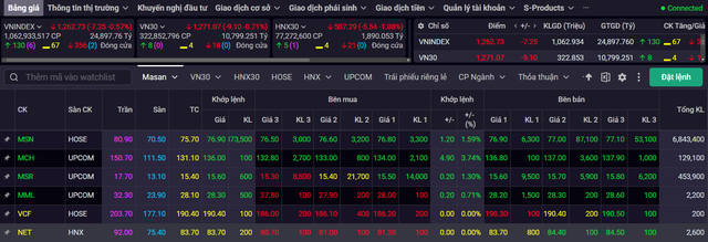 Kết thúc ngày 6/3, sau giai đoạn hưng phấn thị trường chứng khoán đã chứng kiến một phiên "điều chỉnh" khi VN - Index đã giảm 7,25 điểm xuống còn 1.262,73 điểm. Trên sàn HoSE, đã có tổng cộng 356 mã giảm điểm và chỉ có 130 tăng và 67 mã ở tham chiếu.