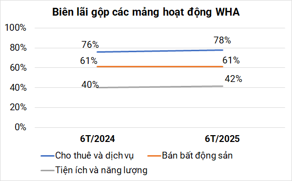 Với mảng tiện ích và năng lượng (điện và nước) doanh thu gần 1.8 tỷ baht (55 triệu USD), tăng 5%; biên lãi gộp ở mức 42%. Riêng kinh doanh nước, WHA ghi nhận tổng doanh số bán nước tại Việt Nam (dựa trên cổ phần sở hữu) là 18.6 triệu m3 trong 6 tháng đầu năm, nhờ doanh số bán nước tăng từ dự án Sông Đuống.