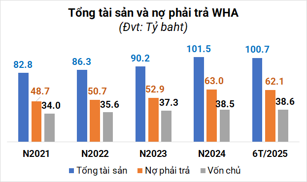 Tính tới cuối tháng 6/2025, tổng tài sản hợp nhất của WHA đạt hơn 100.7 tỷ baht (hơn 3.1 tỷ USD), giảm nhẹ 1% so với đầu năm. Trong đó vốn chủ sở hữu hơn 38.6 tỷ baht (gần 1.2 tỷ USD), nợ phải trả 62.1 tỷ baht (1.9 tỷ USD), vốn điều lệ gần 1.5 tỷ baht (46 triệu USD).