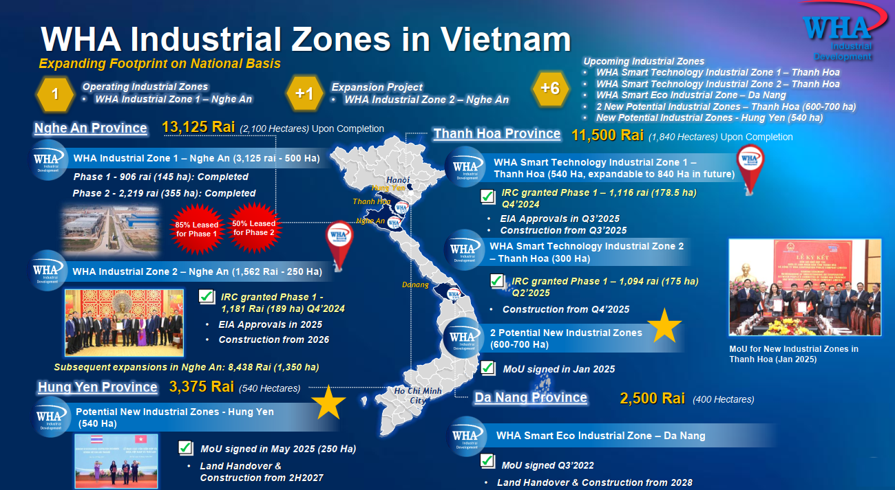 Cuối quý 2, WHA vận hành 15 KCN tại Thái Lan và 1 KCN tại Việt Nam. Tập đoàn cũng đang phát triển 7 dự án KCN tại Thái Lan (tổng diện tích hơn 1,400ha). Dự án mới nhất là KCN WHA Eastern Seaboard 5 (giai đoạn 1 và 2), khoảng 800ha đang được phát triển theo mô hình KCN sinh thái thông minh nhằm hỗ trợ các ngành công nghiệp thế hệ mới. Đợt chuyển nhượng đất đầu tiên dự kiến diễn ra vào quý 1/2026.
