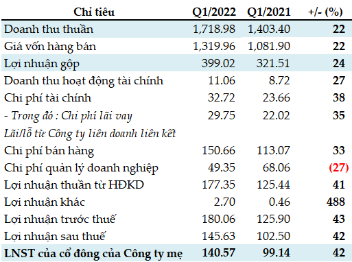 Về tình hình kinh doanh quý 1/2022, doanh thu thuần tăng 22% so với cùng kỳ, đạt gần 1,719 tỷ đồng và lãi ròng gần 141 tỷ đồng, tăng 42%.